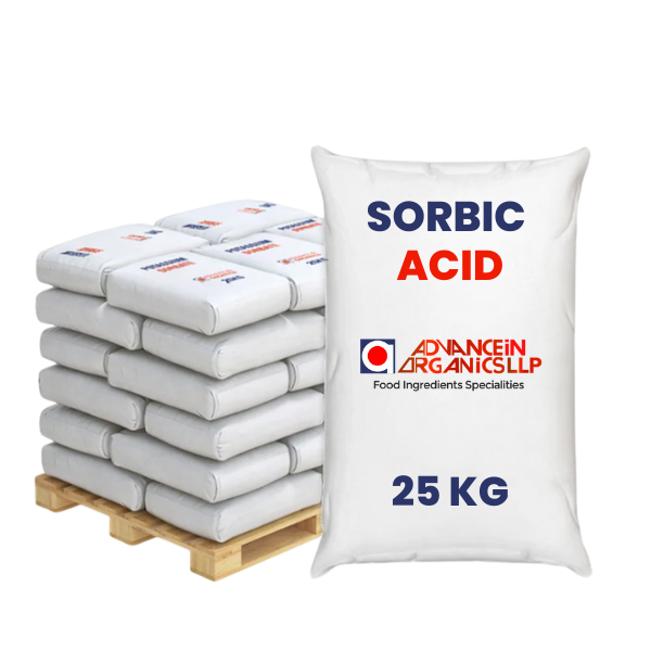Sorbic Acid (E200, Hexadienic Acid or 2,4-Hexadienoic Acid) is a white crystalline powder with a characteristic odor. Sorbic Acid preservative is very soluble in alcohol and ether while soluble in acetone, acetic acid, hot water and oxygenated solvents. E200 preservative is slightly soluble in water, oils and glycerol. Advance in Organic is a reliable Sorbic acid manufacturer & supplier in India. We can supply high quality Sorbic Acid for sale in food and cosmetics at a competitive Sorbic Acid price.